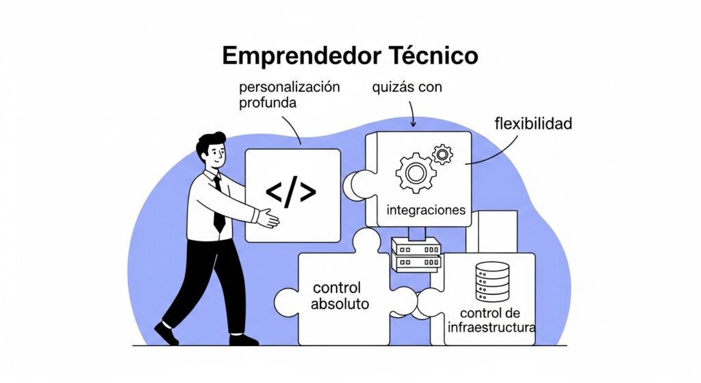 - Prioridades: Personalización profunda del código, integraciones a medida con sistemas internos (como un ERP o CRM), control absoluto sobre la infraestructura y propiedad completa de los datos.