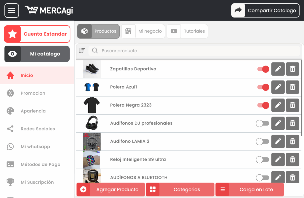 Si tienes muchos productos, los planes de pago de Mercagi ofrecen una opción de «Carga en Lote» para subirlos todos de una sola vez.