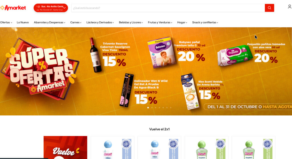 Amarket es un supermercado online enfocado 100% en Santa Cruz. Esta tienda online hiperlocal ofrece un catálogo completo que incluye abarrotes, carnes, lácteos y frutas. Su integración con el ecosistema de Farmacorp sugiere un respaldo logístico y de pagos robusto.